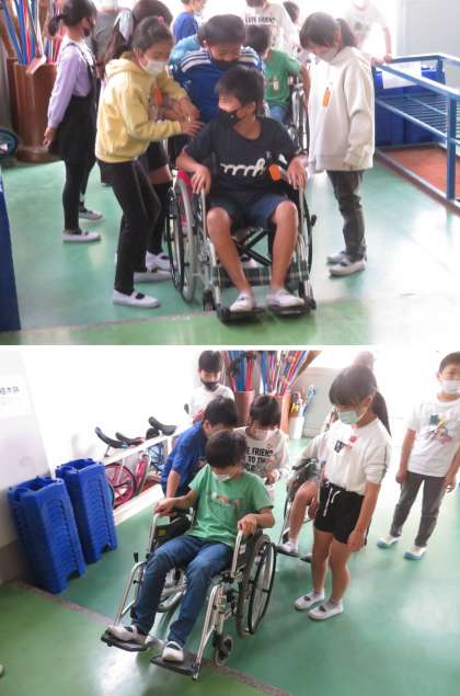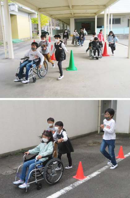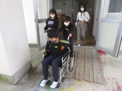 車椅子体験2クラス目です。段差や坂を降りるときは、後ろ向きにした方が、乗っている人が安心できます。それも体験してみないと分かりませんよね。