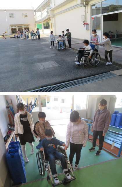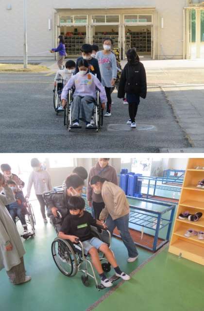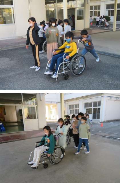 車椅子体験、3クラス目です。車椅子に乗った子が、自走している時に、速効の網目にはまって動けなくなりました。車椅子の大変さを感じていました。また、車椅子の押し方のコツがつかめたので、これから車椅子の人を見かけたら手伝おうと思うという感想も聞かれました。