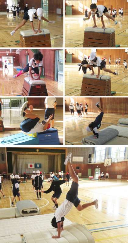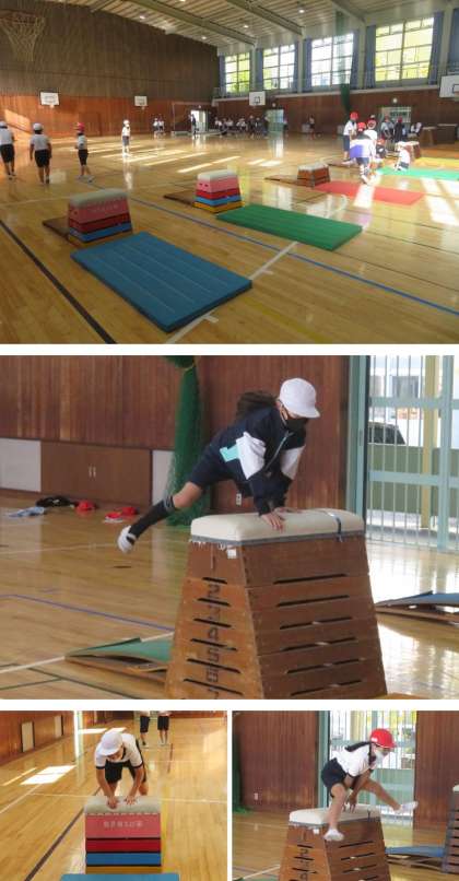 開脚跳び、閉脚跳び、台上前転、側方倒立跳び、頭はね跳び、前方倒立跳び