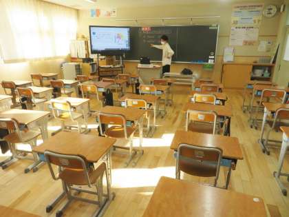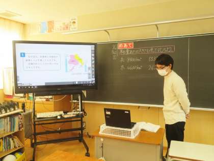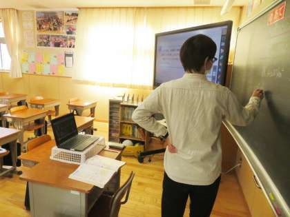 学級閉鎖をした5年生の1クラスは、リモートで授業を進めています。子供たちがいないせいか、担任の背中が少し丸まっていますが、リモートでしっかりつながっています。