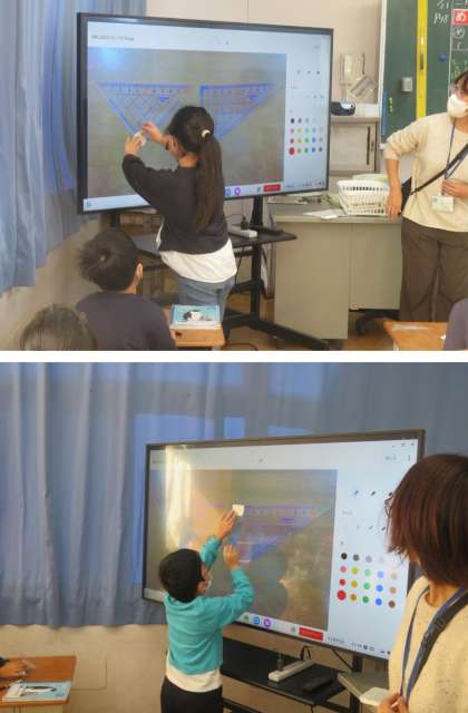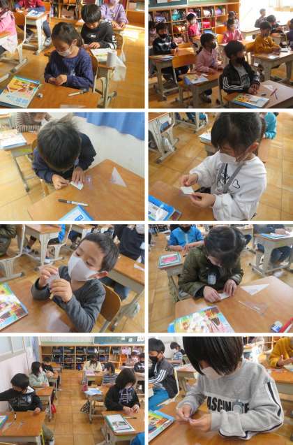 直角の学習です。紙を2回折って、直角マシーンを作りました。これがあれば、角が直角かどうか簡単に調べられます。この日初めて使う2つの三角定規の角に直角があるか調べました。