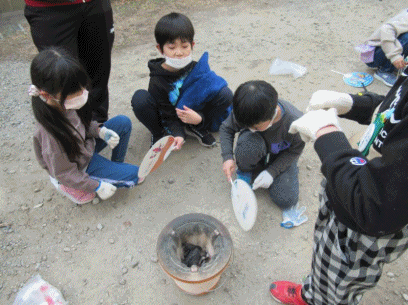 総合的な学習の時間「昔の道具を使ってみよう」で、七輪の体験をいました。枯れ葉の上に炭を入れ、火をおこすことができたら、金網を置いて餅を焼きました。焼きあがったら、自分達で作ったきな粉をつけて味わいました。