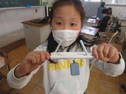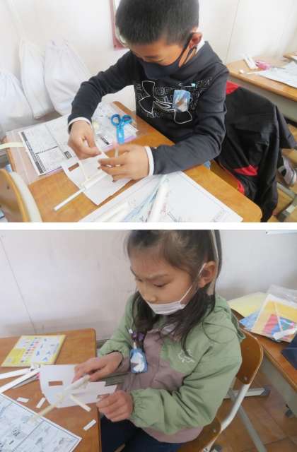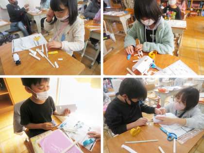 ストローを組み合わせて、動く仕組みを作ります。その動きから想像したものを作ります。左右に動いたり、上下に動いたり、自分の作りたい物に合わせて、組み立て方を変えます。