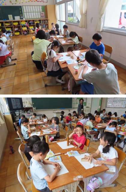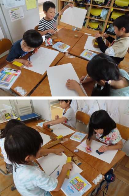 動物や乗り物、ロボット、お城など、様々な絵に仕上げました。ソフトクリームを描いた子もいたようです。
