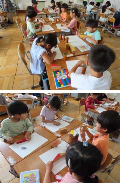 積み木の面を写し取り,それを使って絵かきをしました。よ〜く見ると、積み木には、四角、三角、丸などのいろいろな形の場所があります。四角でも、長四角もあります。