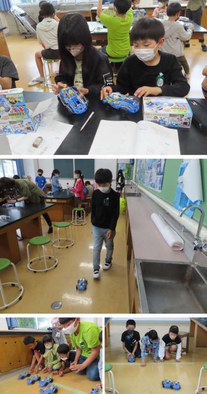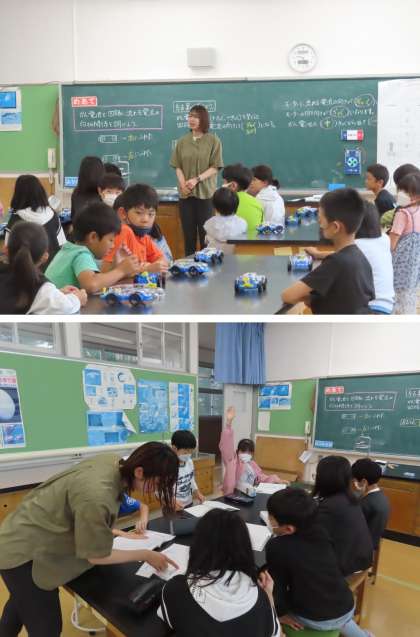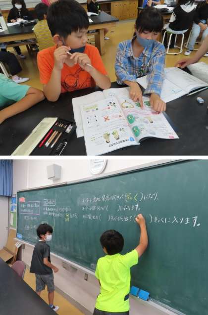 この授業は、隣のクラスに出張し行っている理科の授業の様子です。この日は、電池の向きを変えたときの電流の向きについて調べました。