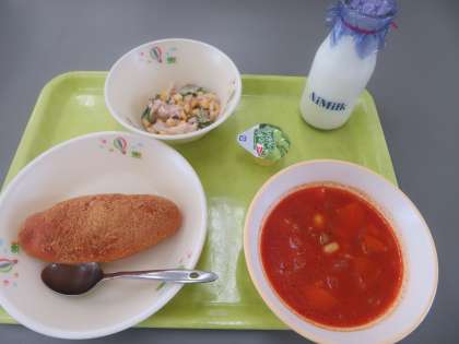 6月7日、歯と口の健康週間3日目「よく噛もう」は、豆入りトマトスープがつきました。豆が入っていますので、そのまま飲み込むわけにはいきません。ちゃんと噛んでから、ゴックンします。