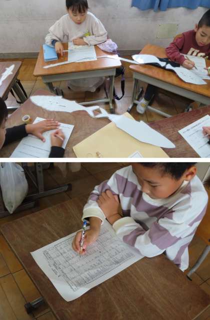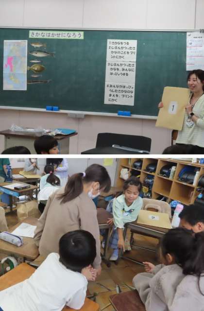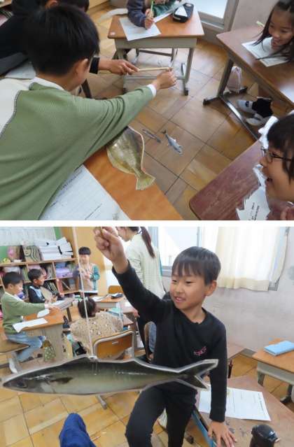 教室に、常滑の海で捕れる魚が釣れる釣り堀ができました。魚を釣って、釣れた魚を2枚におろして(?)みると、中には、その魚の名前、大きさ、とれる時期、特徴が書いてあります。魚を食べるよさも、しっかりと教えてもらいました。