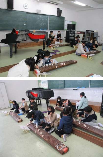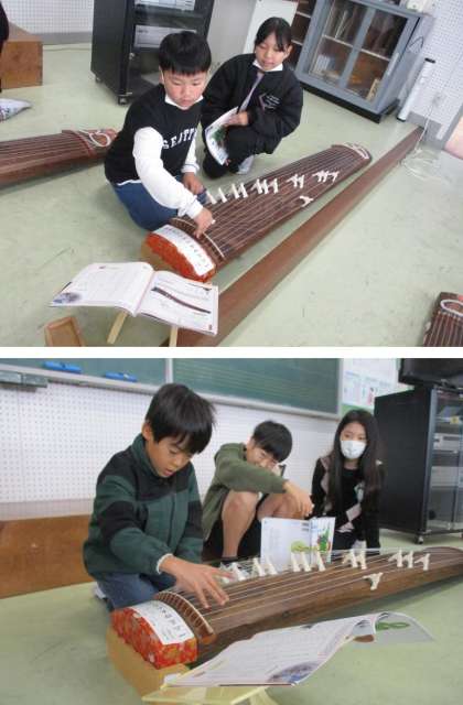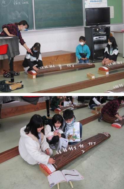 音楽では、和楽器に親しむ内容が盛り込まれています。東小には、和太鼓がありますので、これまで太鼓を使ってきました。今回は、南陵中からお借りして体験することができました。