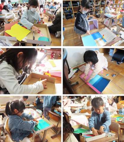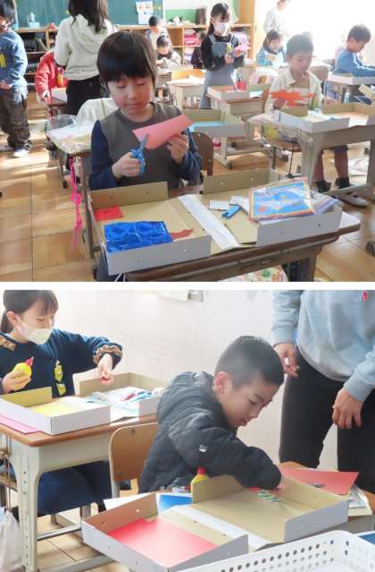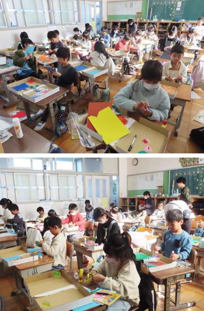 学期末を間近に控え、このクラスはお話双六作りのラストスパートです。ひとりの子の面白いアイデアを全体に紹介したら、「それ、いい! 僕もやってみよ。」とつぶやく子もいたようです。取り入れた子はもちろんですが、取り入れられた子も嬉しそうでした。