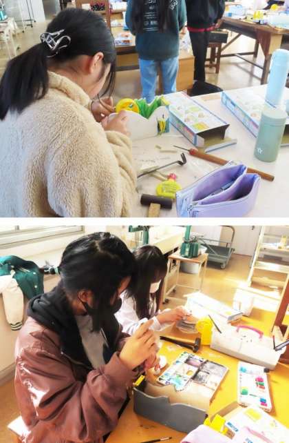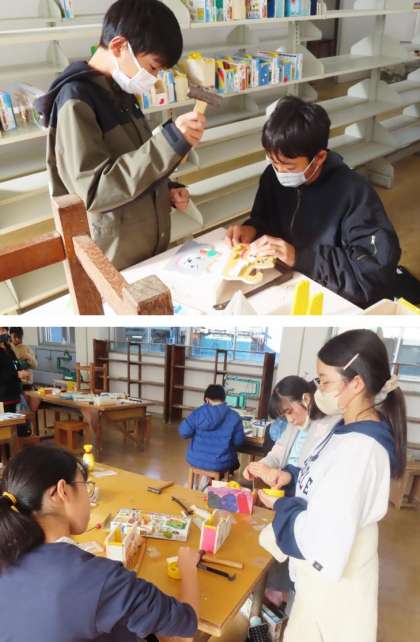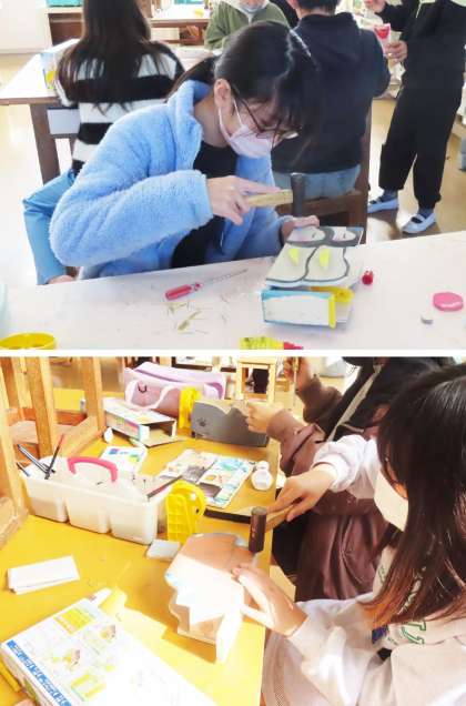 テープカッター製作の最終工程、組み立てです。板を釘で打ち本体部分を組み立てます。その後プラスチックの部品をネジ留めすると完成です。