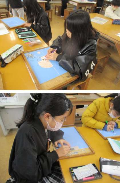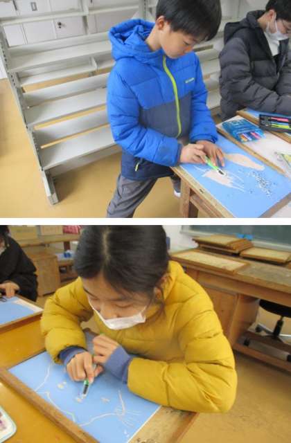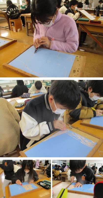 木版画の版木を掘り始めた学級が出始めました。どこを掘って、どこを残すかを考えながら彫り進めます。使う彫刻刀によって、線の柔らかさや鋭さの違いを出すこともできます。