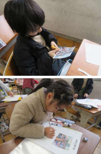 産まれてからの今までの自分の記録アルバム作りの様子です。この学級も、大詰め、2年生の思い出のページに入りました。写真を選んで、台紙に貼り、説明を書いたら、クリアファイルに収めます。