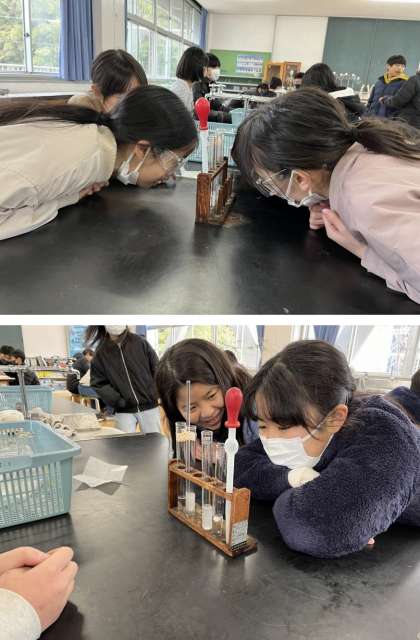 前の時間に、アルミニウムを溶かした塩酸を蒸発させて取り出しました。この時間は、その白い粉が、元のアルミニウムかどうかを調べます。白い粉を塩酸に入れると溶けてしまいました。でも、アルミニウムを溶かした時のように泡は出ませんでした。水に入れてみると、白い粉は溶けてしまいました。