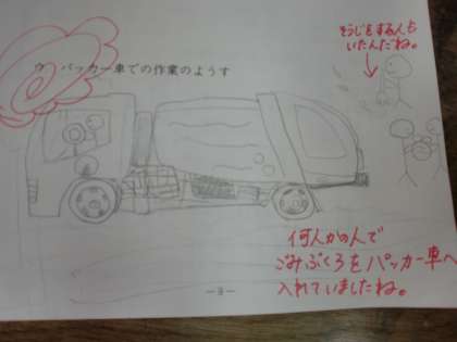 宿題は、ワークブックに書いてくるように伝えましたが、写真を撮って、それに説明文を加えたり、見たことを図と文で分かりやすく表していたり、工夫いっぱいだったので、それぞれのワークブックを見合いました。パッカー車が今回見られなかった子も、友達のワークブックを見て、新たな学びができたようです。