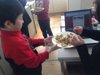 3人の創意工夫のお好み焼き、4年生と6年生に食べてもらって、気に入った「作品」を投票してもらう。