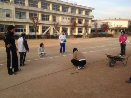 委員会後、担当の教員がロープやハンマーを持ち出して、ペグを打ち付けていきます。