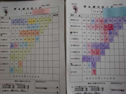 今日は3学期初めての体育でした。ペアを作り、なわとびカードを使って、冬休みの練習の成果を試しました。2学期の終わりにもカードにたくさん塗れていた子も、「記録更新!!今日2マスも塗れた」と嬉しそうでした。3組では、記録を取った日ごとに塗る色をかえています。授業で何回もやっているので、カラフルなカードになってきました。