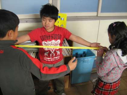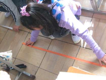 自分の体を使って予想したり、教室の床のマス目を使って予想したり、たくさん考えながらの活動です。