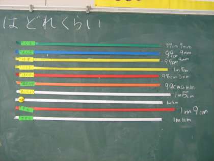 それらを1メートルものさしで計り、1番1メートルに近かった子を決めました。