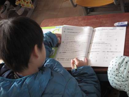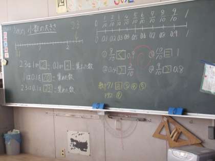 算数では、『小数』の学習をしています。授業公開では、はしたの大きさと小数について学習をし、今日は、小数の大きさについて学習をしました。数直線に表して、数の大小を比べたり小数の仕組みについて考えました。少し難しかったようですが、教科書の問題や友達からの問題、問題集などたくさんの問題を解くことで、