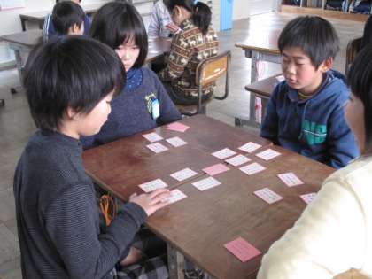 国語で百人一首をしました。5色百人一首で今日はピンクのカードを使いました。20首を机並べてまずは練習…。上の句をしっかり聞き、下の句が聞こえた瞬間に「はい!」と勢いよくカードを取ることができました。慣れてくると、上の句を読み始めると同時にカードを取れるようにもなり、お手つきやカードの取り方などクラスでルールを決めると、もっと楽しくなりました。