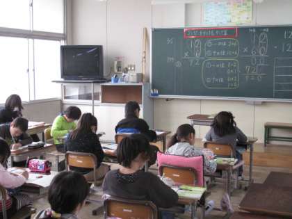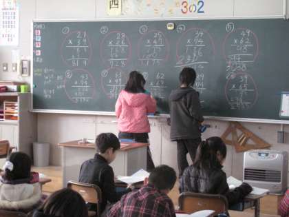 算数で「2けたをかけるかけ算の筆算」をしています。筆算の仕方を勉強し、たくさんの問題を解いています。慣れてくると、