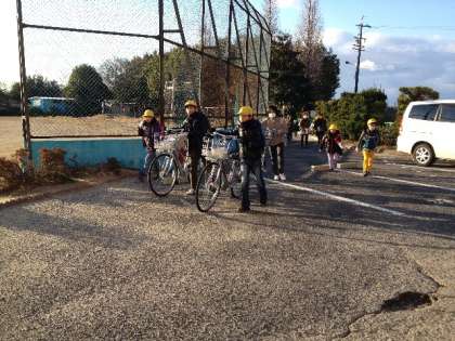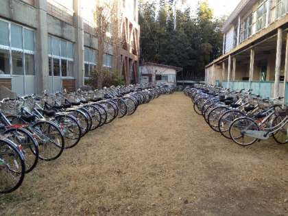 6年生が自転車を引いて登校