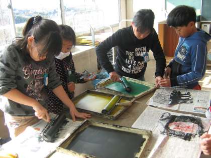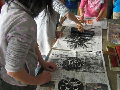 技法は,いろいろありますが,バックをローラーで自由にぬってみました。インクを程よくローラーに付けるのが難しく,班の友達と試行錯誤でした。