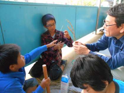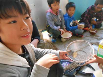 2週間目に収穫した稲からお米を脱穀しました。今回もJAかじま台支店の方などに来ていただき、指導していただきました。すりこぎやすりばち、野球ボールを使いながら籾とお米を分けていきました。今は機械を使えば簡単にできますが、昔は一粒一粒苦労しながら脱穀していたことを、身をもって学ぶことができました。自分達が育てたお米を見て、笑みがこぼれる子どもが多くいました。当たり前のように食べているご飯。一粒の重みを体験を通して学んでいます。