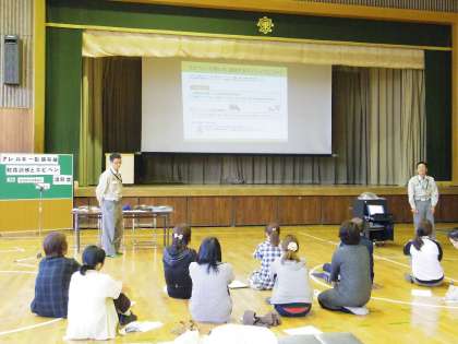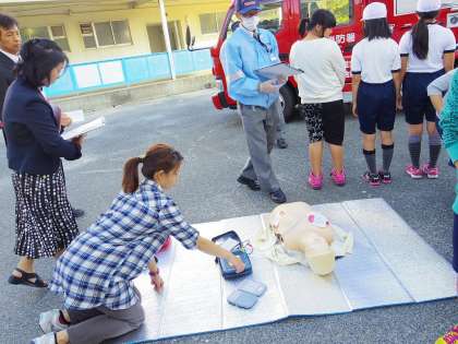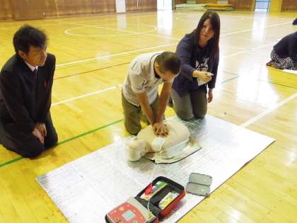 その後、教員全員で胸部圧迫法とAEDによる心肺蘇生とエピペン投与を訓練しました