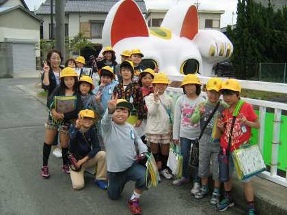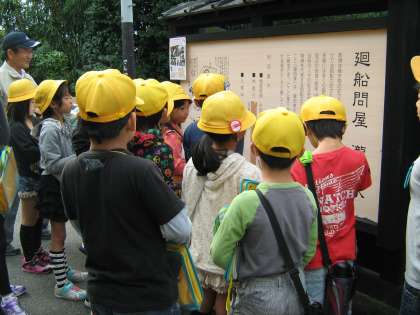 総合「常滑焼きについて知ろう」の学習で、今日は焼き物散歩道の見学をしました。登り窯、土管坂、廻船問屋瀧田家など、ガイドさんの話を聞きながら見学をしました。散歩道を歩いていると、電纜管、エゴロ、ダンマ、焼台などたくさんの焼き物を見付けることができました。
