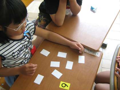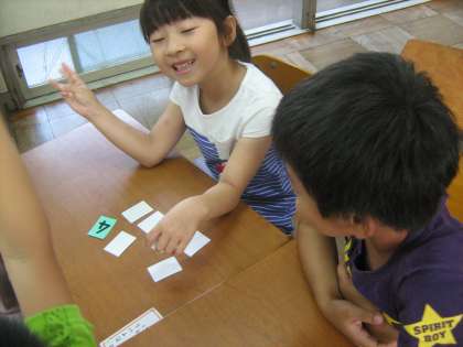 今日のゲームは9作りゲームです。2枚のカードをめくって9を作ります。いくつといくつで9になるのか、考えながらめくっていきました。