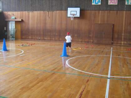 かわいいミニハードルが体育倉庫にあったので、今日はそれを使って走り競争をしました。3つのミニハードルを上手にとびこえて、フープの中に玉を狙って入れます。みんなで気持ちのよい汗をかきました。