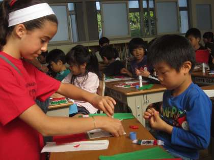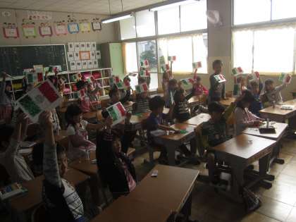 メキシコの友達に教えてもらい、メキシコの国旗のちぎり絵をしました。赤・緑・白の三色の紙をていねいに貼り付け、真ん中のわしやサボテンにも色を塗り立派なメキシコの国旗を完成させました。最後はスペイン語のありがとう「グラシアス」でお礼を言いました。
