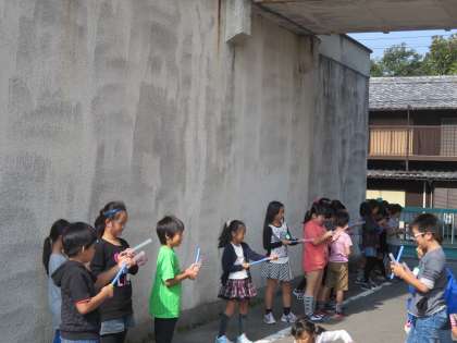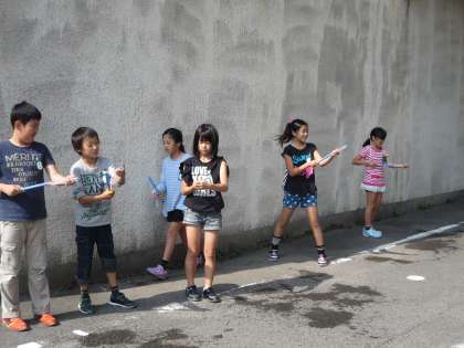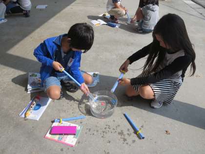 一人一人、空気鉄砲をもって外に行き、閉じ込めた空気と水では、どんな違いがあるのか体験しました。