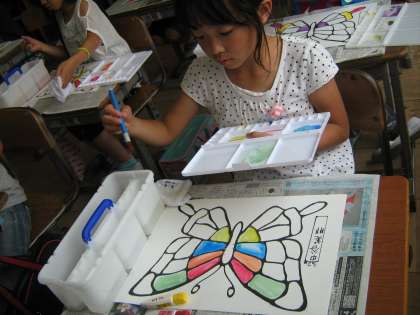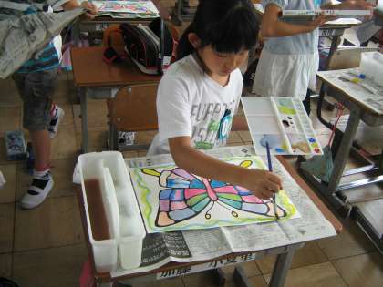 中には色を塗った所に重ねて色を塗り,にじみ出る色を楽しむ子もいました。