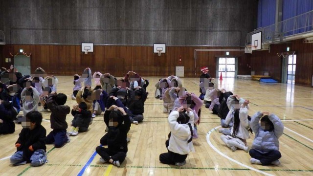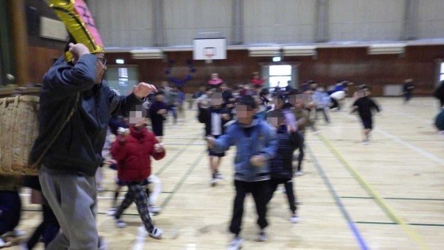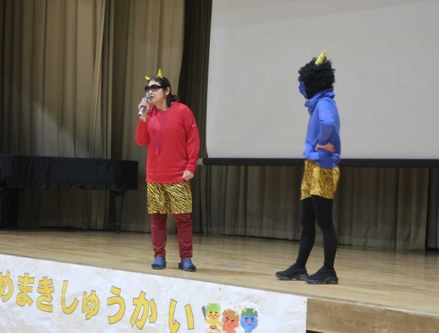1年生のまめまき集会の様子です。今年も、エンマ大王が登場しました!