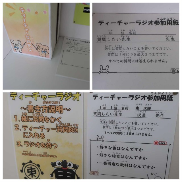 総務委員会の児童による「ティーチャーラジオ」が始まります。全校のみなさんから、先生たちへの質問を募集し、実際に総務委員の子がインタビューに行きます。それをまとめて、昼の放送で流すという活動です。今日は、校長室に2名の総務委員かやってきました。なかなか手ごわい質問もありましたが、ちゃんと答えたので、放送をお楽しみにしていてください。放送は、来週から始まるそうです。保護者の方は、ぜひご家庭での話題にしてください。