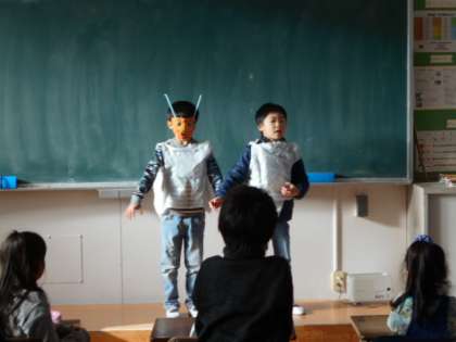グループごとに出し物を考えて発表しました。みんなが楽しめるように相談して準備をしたおかげで、楽しい会になりました。