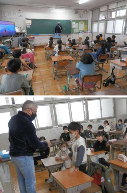 この日の英語活動は、ALTと一緒に授業を行いました。初めは、ALTと一人一人英語での挨拶です。1年生は初めて会うので、Nice to meet you.ですが、2年生は使えあせん。Hello. How are youu.で挨拶です。