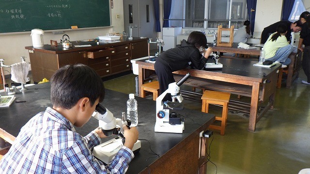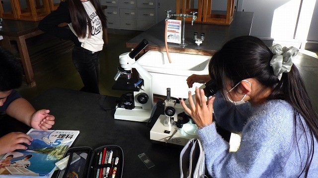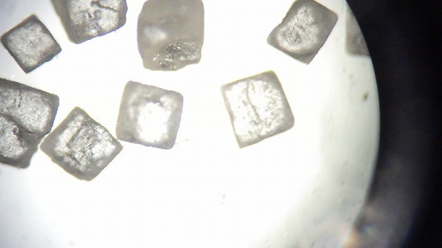 双眼実体顕微鏡を使って花粉や食塩の粒を見ました。くっきり見えていますね。