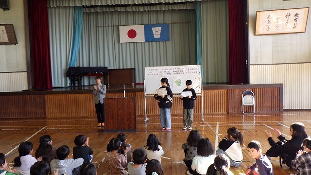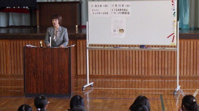校長講話で「スポーツの秋」として11月2日(日)に行われたスーパードッジボール大会で「南陵ガールズ」が表彰されたこと、15日(土)に鬼崎中学校で「とこなめ体力向上プロジェクト研修会」が行われることを紹介しました。10月31日に「Home&school 」で案内されている案内では、11月4日が締め切りとなっていますが、定員に達していないため、明日まで受け付けてくれるそうです。予定がない人は、おうちの方にお願いをしてみましょう。また、12月6日(土)の「愛知県市町村対校駅伝大会」に6年生女子児童が常滑市代表選手として選ばれました。テレビ中継がされます。走ることは、心臓や肺の機能を向上させること、勉強に集中する力がつくこと、気分がりフレッシュされ、ストレスも減るそうです。大放課に「マラソン運動」で走って応援しましょう。学校外の活動、委員会からの表彰も行いました。