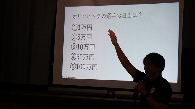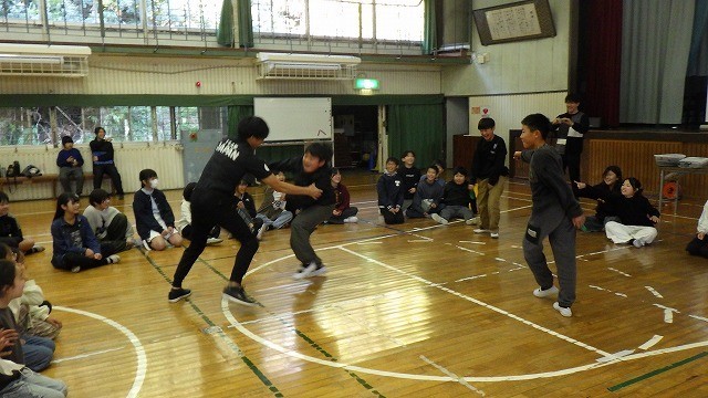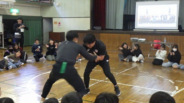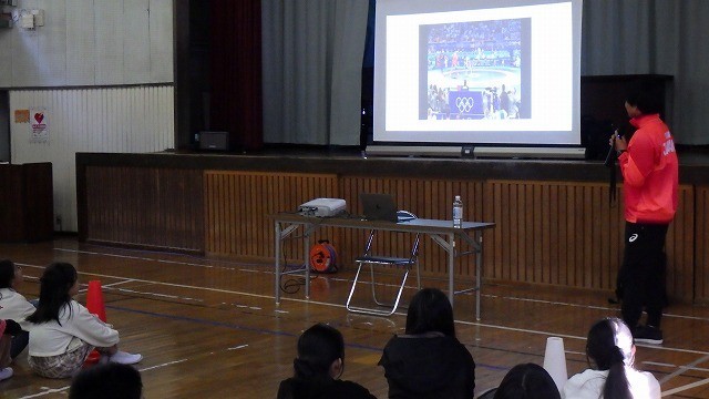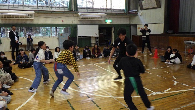 パリオリンピック2024大会のコーチとして参加した常滑市出身の前田様を講師にお招きし、選手時代、コーチ時代の話をお聞きしました。「人生は一度きり」という考えの下、大切にしている言葉、「人生は思った通りになる。思った通りにならないのは想いが足りないからだ。」「他責ではなく自責。全部、自分で解決できる。」など、たくさん教えていただきました。また、子どもたちや教員と対決して、しっぽとりをしました。全く太刀打ちできず、盛り上がりました。さらに、クイズ正解者にプレゼントをいただきました。楽しい時間をありがとうございました。
