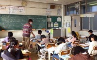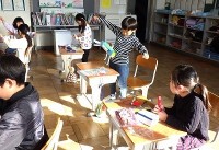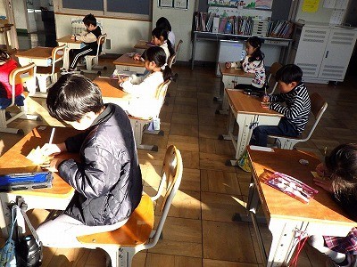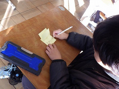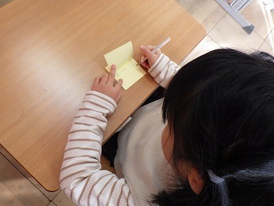 児童会の提案による「ハッピープロジェクト」。付箋にハッピーなことを書いて学校全体に明るい気持ちを広げようというものです。1年生が、朝の学習時間を使って、ハッピーになる言葉を書いていました。目標1000枚のメッセージを集める計画です。