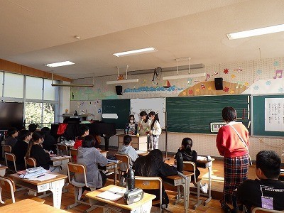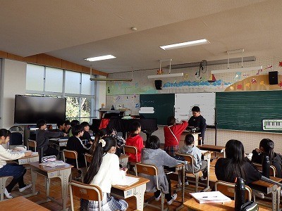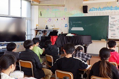 「音楽を楽しむ」を目標に、歌を歌ったり、ハンドベル、リコーダー、木琴、ピアノ演奏をしたりして楽しみました。校歌のピアノ演奏に合わせて歌っていました。終業式もばっちり歌えそうですね。