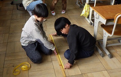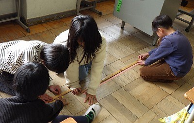 紙テープを1mだと思う長さに切って確かめていました。長さを感覚でつかむことができたかな。