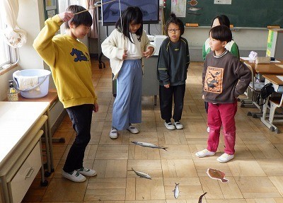 栄養教諭の先生と一緒に学習をしました。海に隣接している常滑市では魚がたくさんとれること、魚釣りゲームをして魚の名前、大きさ、とれる季節など魚への興味、知識を高めました。魚を食べるよさを知り、魚を食べたい気持ちが育っていました。