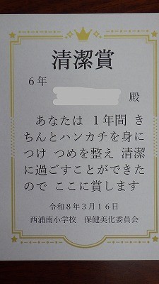 保健美化委員会より1年間の清潔検査調べで、清潔に気をつけて過ごせた人の表彰がありました。全校で16名の表彰がありました。おねでとうございます。健康な生活を送ることができるよう、ハンカチを持ち、爪を切るなどの習慣を身につけましょう。