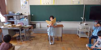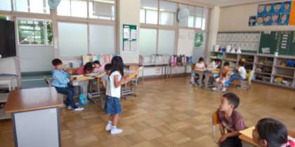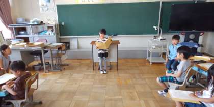 「やさいをそだててみよう」です。グループで話し合い、代表の子が発表をしています。